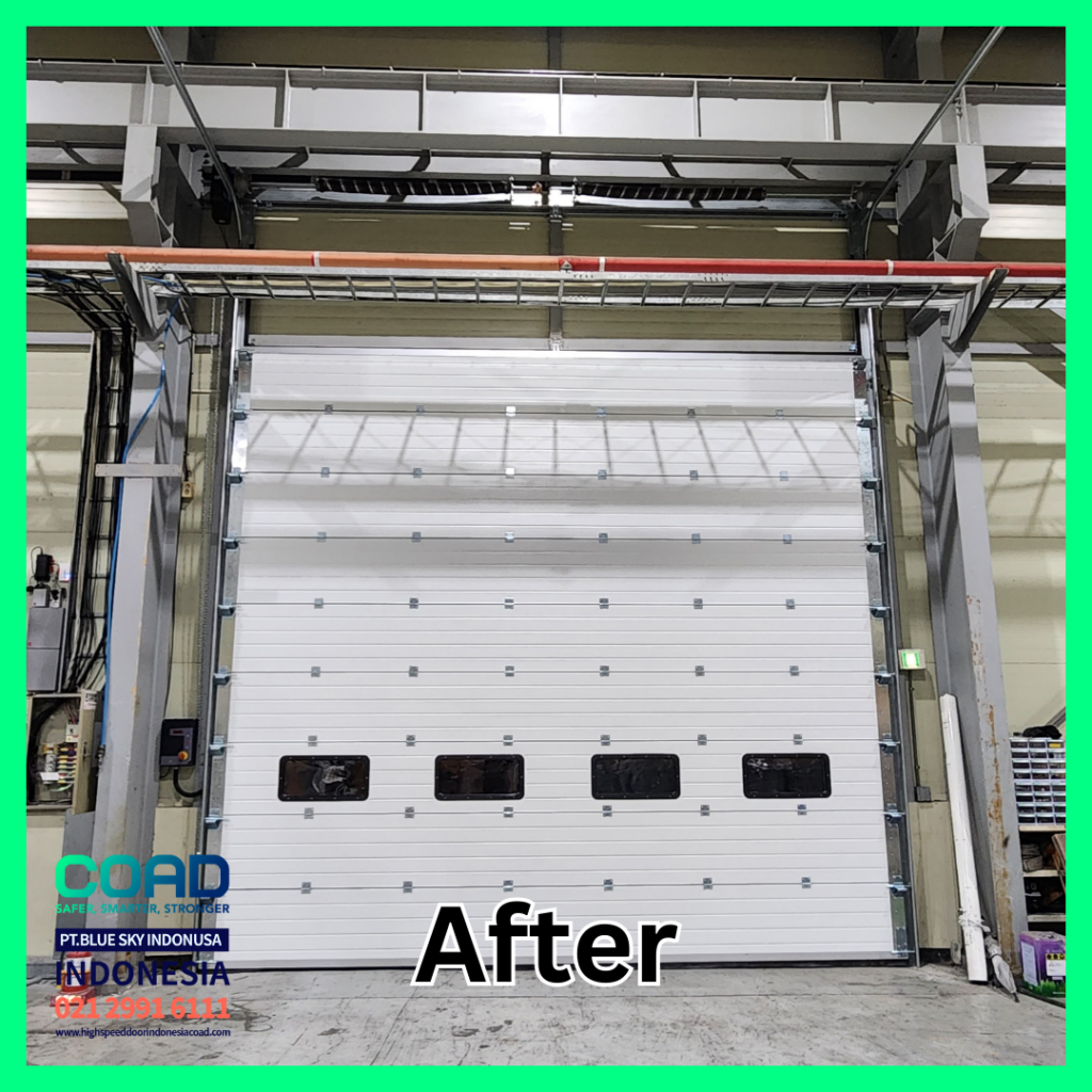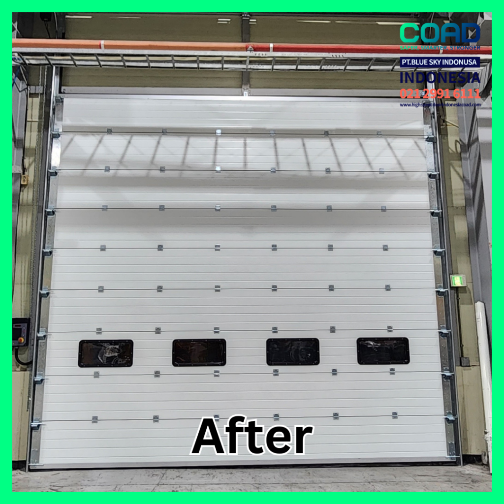 Untuk mengoptimalkan proses logistik di area loading, COAD Sectional Overhead Door adalah pilihan terbaik. Dengan kombinasi kecepatan, keamanan, daya tahan, dan fleksibilitas, pintu ini dirancang untuk mempercepat pergerakan barang, mengurangi waktu tunggu, dan menjaga efisiensi energi.