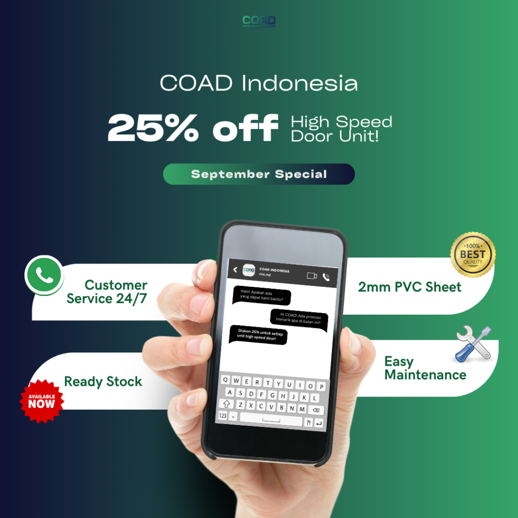Automatic sectional door adalah solusi ideal untuk membatasi area dengan perbedaan suhu dan meningkatkan efisiensi operasional di pabrik Anda. Dengan kemampuannya untuk mengontrol suhu, menghemat energi, dan meningkatkan keamanan, pintu ini menawarkan banyak manfaat bagi bisnis Anda. Di COAD Indonesia, kami siap membantu Anda memilih pintu otomatis yang sesuai dengan kebutuhan spesifik pabrik Anda. Hubungi kami untuk informasi lebih lanjut dan temukan bagaimana automatic sectional door dapat mendukung keberhasilan operasional Anda.